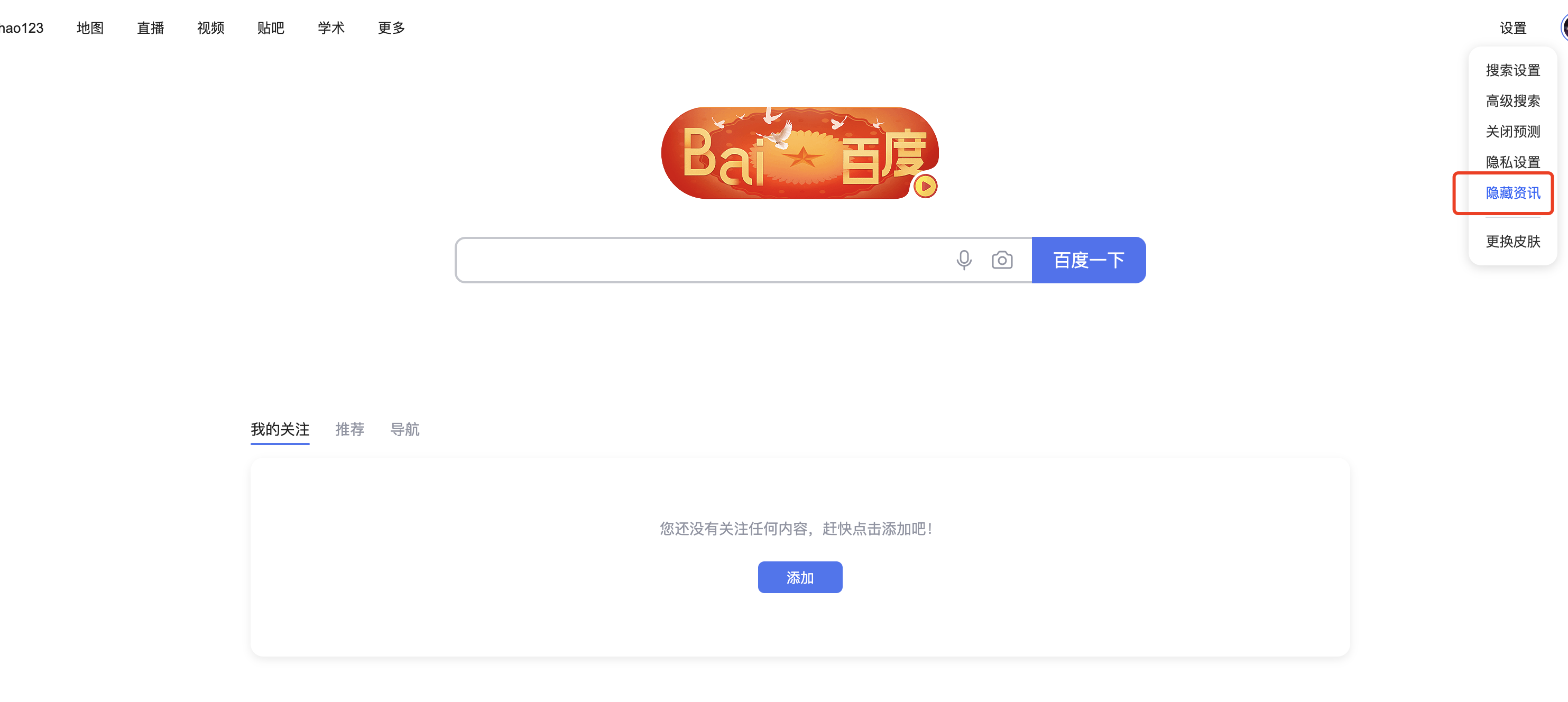 首先打开浏览器,进入百度首页,如图所示,可以看到有我的关注,推荐,导航等 广告加资讯;不喜欢这个乱七八糟的界面,一键配置解决烦恼.